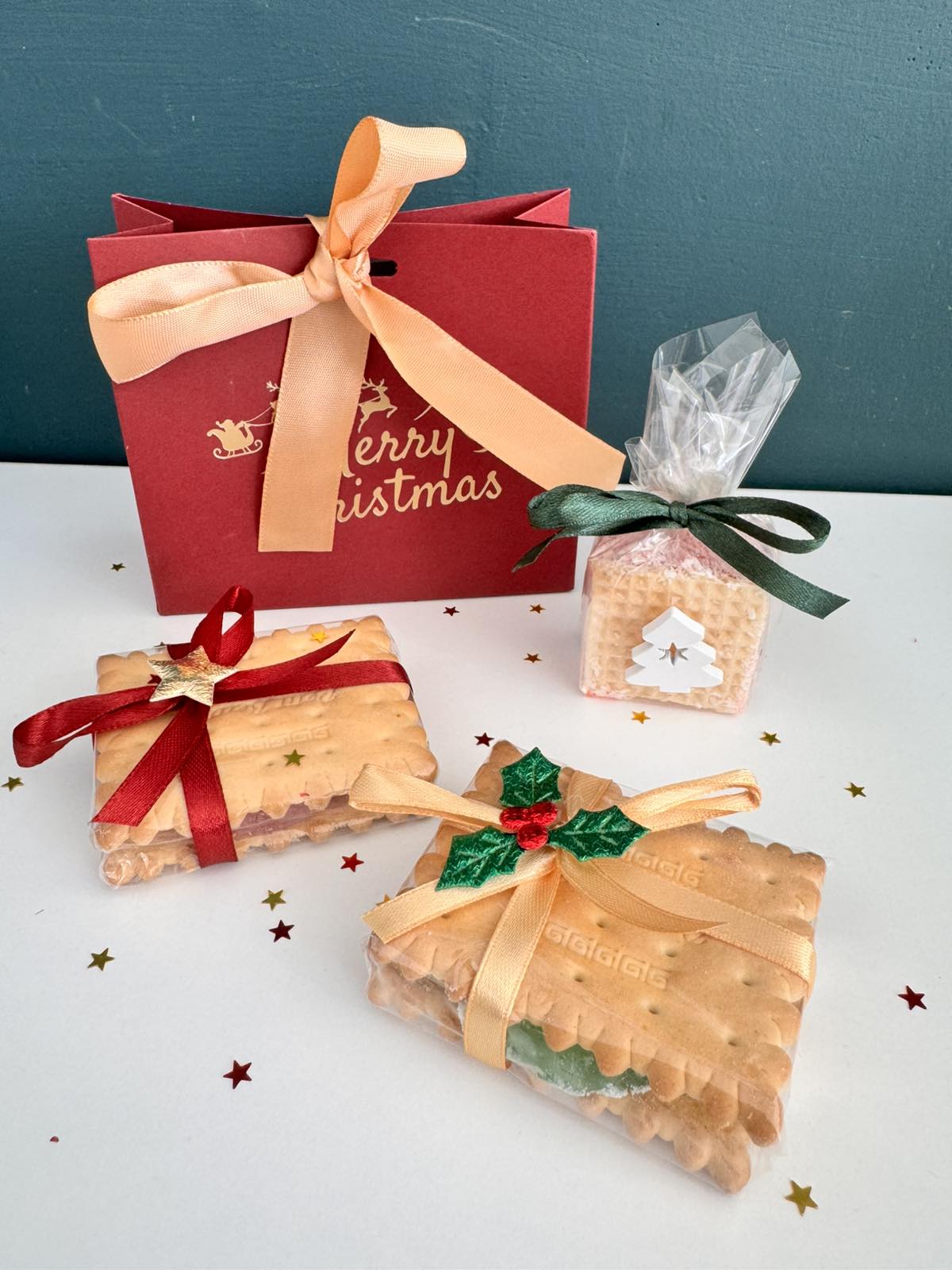 Κάθε τσαντάκι περιέχει δύο (2) συσκευασμένα μπισκοτολούκουμα σε γιορτινό στολισμό (όπως φαίνεται στη φωτογραφία) σε γεύσεις ρόδι και cookies  και ένα (1) ατομικό γκοφρετολούκουμο τριαντάφυλλο και επικάλυψη ινδοκάρυδο, σε γιορτινό στολισμό  (όπως φαίνεται στη φωτογραφία).